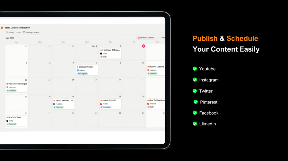 - Schedule your posts in a calendar & track every piece of your content in a single view.
